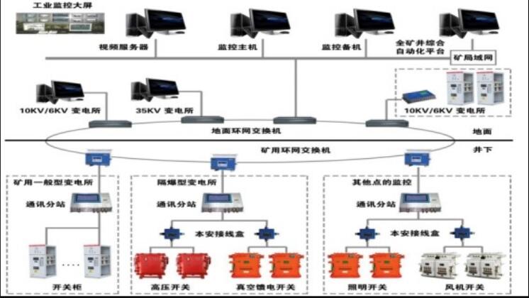 井下变电所安装电力监控分站,变电所高低压开关的综合保护器通过屏蔽双绞线接入变电所的电力监控分站,电力监控分站采用工业以太网与地面监控主站通讯。